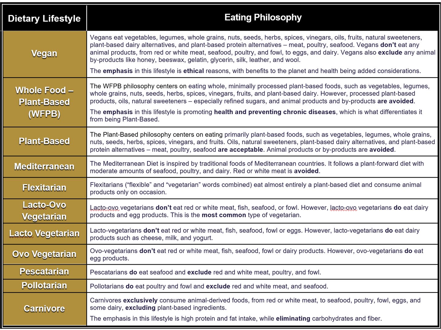 This quick reference guide we created offers a simplified, visual overview of common dietary lifestyles and eating philosophies, highlighting the foods people choose to include or avoid. You can also explore our descriptive table below for a more comprehensive look, each designed to make food philosophies easy to scan and compare, giving you clarity at a glance.